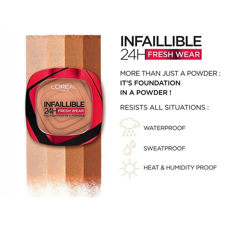 Want lasting coverage with a matte finish? Create a flawless finish with NEW Infallible 24H freshwear foundation in a powder by LOreal Paris. A one-step foundation in a powder that gives you the lasting coverage of a liquid foundation yet mattifies like a powder, for flawless skin that looks fresh hour after hour. Water, sweat and heat resitant. A longwear powder that stays put all day, with up to 24H wear. Discover the rest of the Infallible range (including our much loved 24h Freshwear foundation and our More Than Concealer), for the ultimate longwear makeup regime.