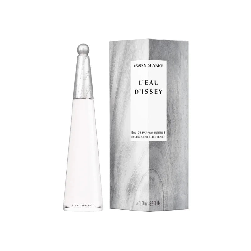 Enjoy the subtle art of design: L'Eau d'Issey Eau de Parfum Intense recalls the emblematic bottle of L'Eau d'Issey, now adorned with a one-of-a-kind, silvery wooden cap inspired by the silvery reflections of the ocean. The bottle transparency echoes the fresh intensity of the fragrance. The silver outerpack, with a powerful wooden texture, matches the cap silvery reflections.